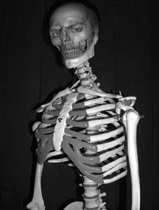 Frontal, 2 ossos parietais, occipital, 2 temporais, esfenóide, etmóide, mandíbula, vômer, 2 ossos maxilares, 2 ossos zigomáticos, 2 ossos lacrimais, 2 ossos palatinos, 2 ossos nasais, 2 ossos da concha nasal inferior, 1 hióide, 7 vértebras cervicais, 12 vértebras dorsais ou toráxicas, 5 vértebras lombares, 1 sacro (5 vértebras sacrais), 1 coccix (5 vértebras coccígeas), clavícula (...)